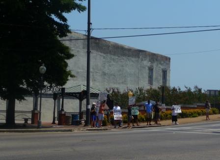 As I rolled into town, and it’s a very small town, you can’t really get lost in there, I ended up right at the foot of that infamous bridge, which is where I parked my car. The electric tableau on some local bank branch showed 103F degrees. The place was, already predictably, quite dead. I thought just a few quick pictures and I’m outta here. But just as I thought that, I saw a small group of protesters near the bridge and decided to check it out. I thought wait a minute, protesters in Selma in 2010? Could it be that the time stopped there? I proceeded towards them.