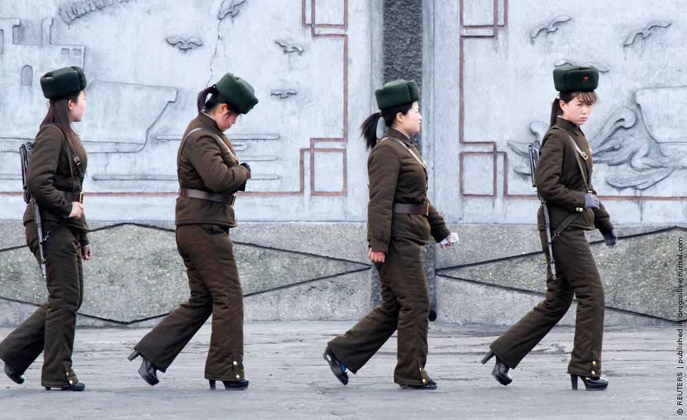 Listen, I only served in the Soviet Army, not in the NK, so I can’t claim to know exactly how it works in NK, but I believe it is similar enough. The discipline was tight where the weapons where available, because the spot check were frequent, so everybody was dressed по уставу. The way it is pictured, this has to be change of guard с двумя разводящими, at least one of whom is always of higher rank. So, the assumption here is that all of them take a TREMENDOUS risk (labor camp anyone? – breaking verboten there equals arbeit mach frei, not a slap on the wrist from your GO teacher, this is real life sh..t, the entire country is ruled with an iron fist, doubly and triply so the army) to parade in front of each other? Because I can guarantee you, even if females are allowed in patrols ( which I doubt very much by the way ) their units are separate from the male’s units…